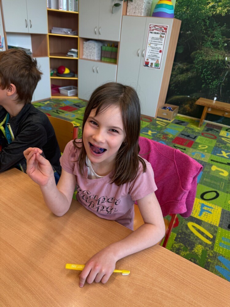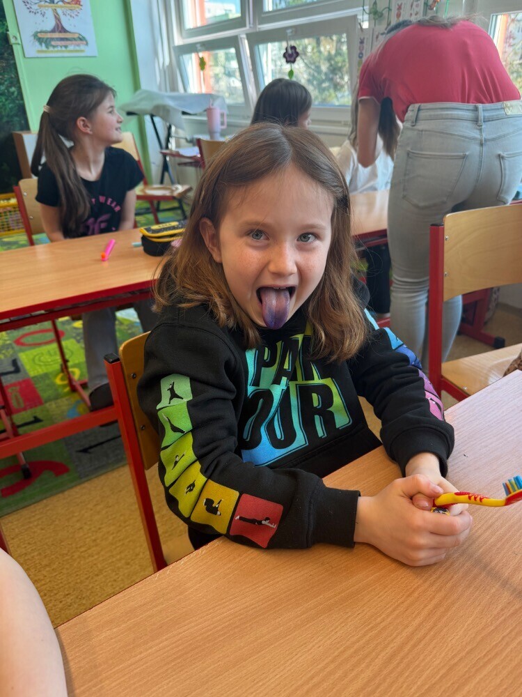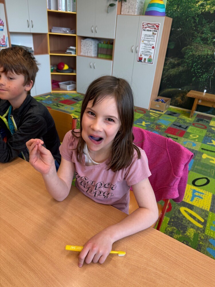 Po úvodních informacích jsme se pustili do samotného čištění zubů, při kterém jsme se snažili řídit jejich radami a tipy. Na závěr jsme vyzkoušeli speciální fialovou vodičku, která nám obarvila zuby v místech, na která bychom se při čištění měli více zaměřit.