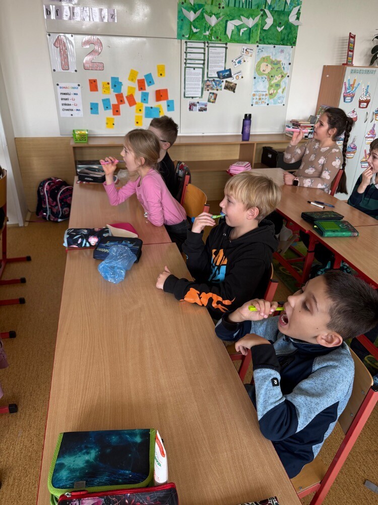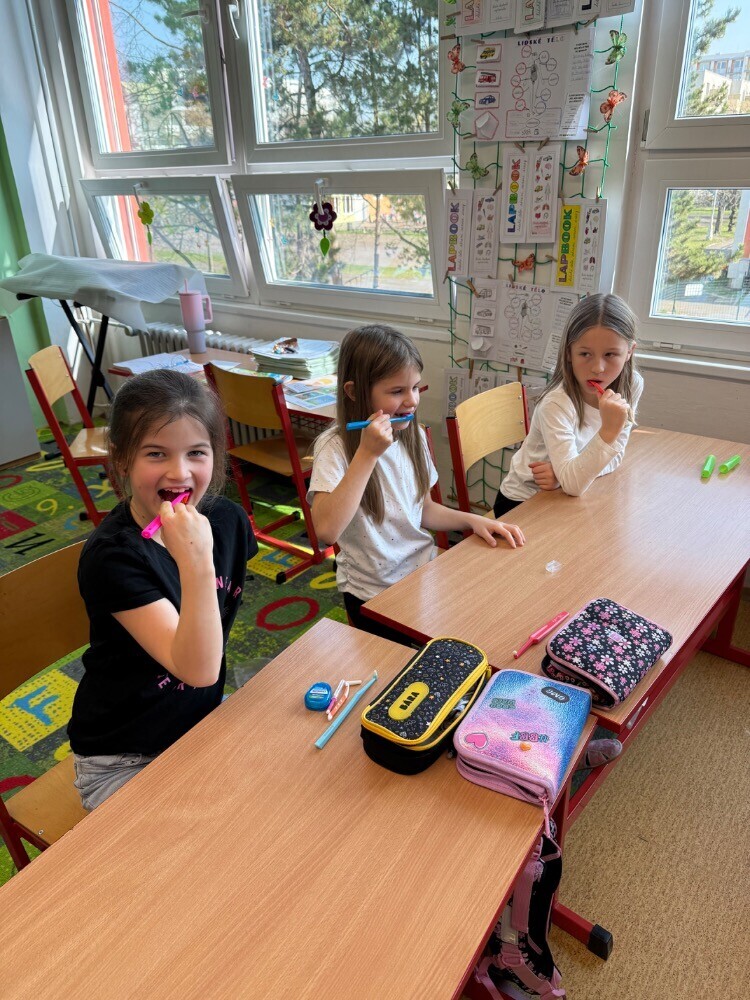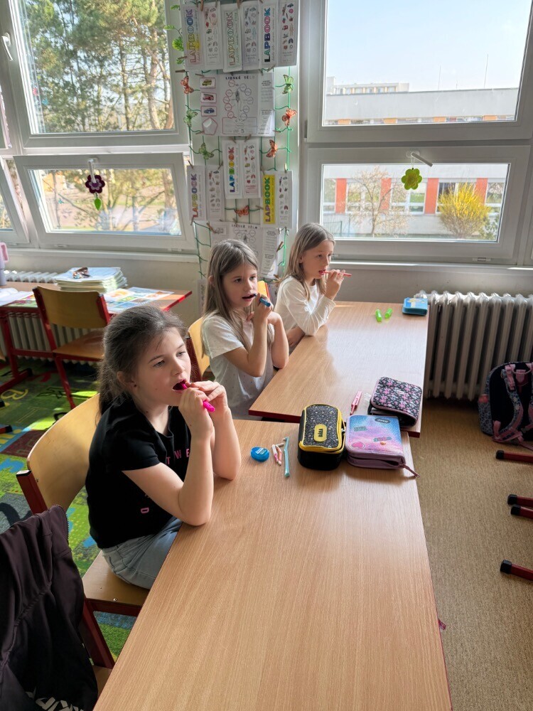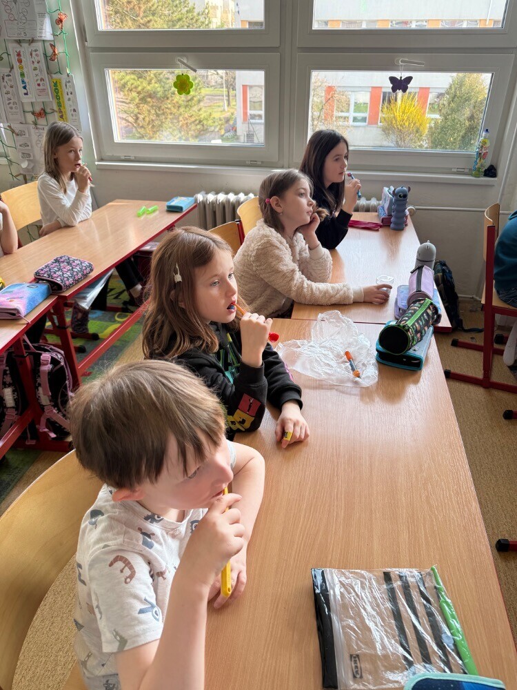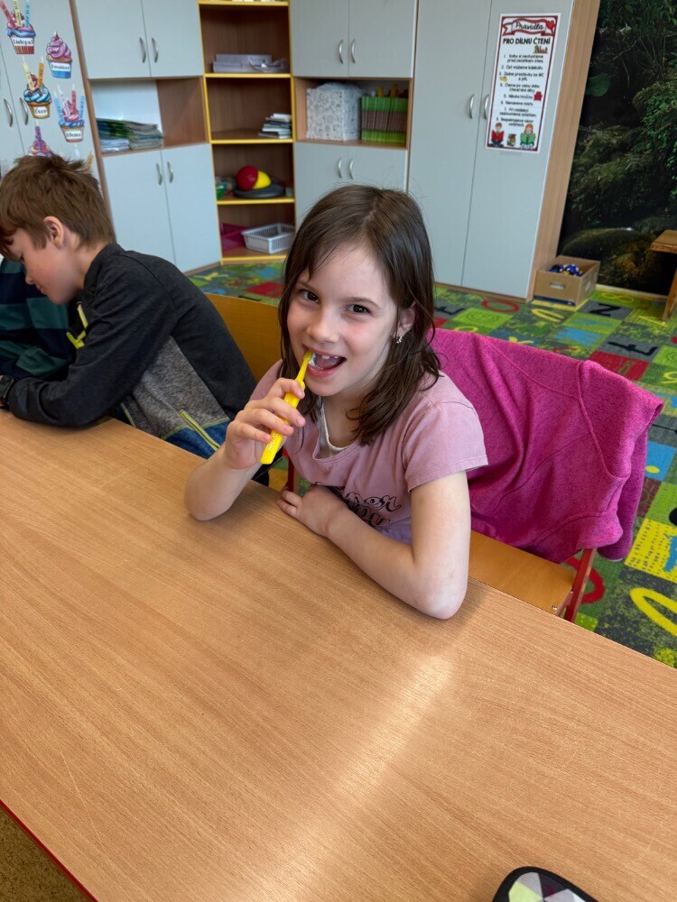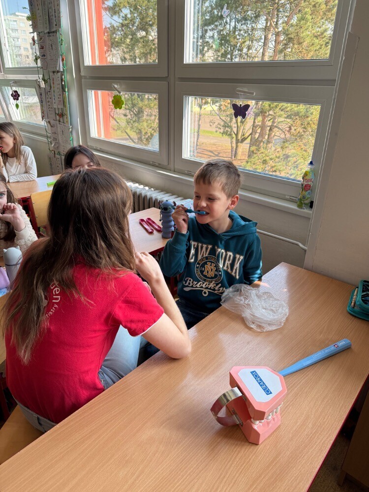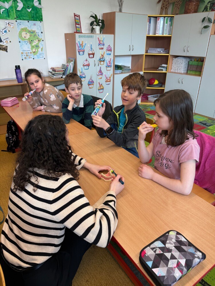 Ve středu nás navštívily studentky zubního lékařství, které si pro nás připravily zajímavou hodinu o péči o zuby. Společně jsme si povídali o tom, jak si zuby správně čistit a jaké pomůcky při tom používat.