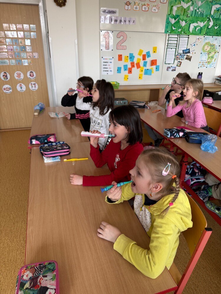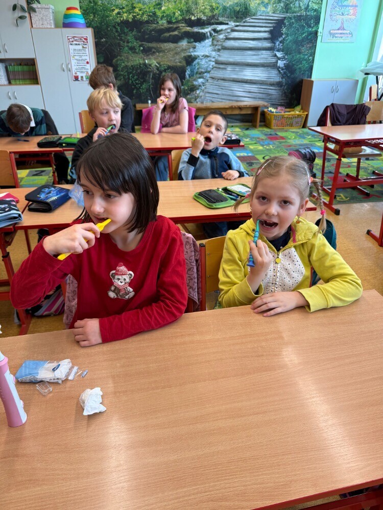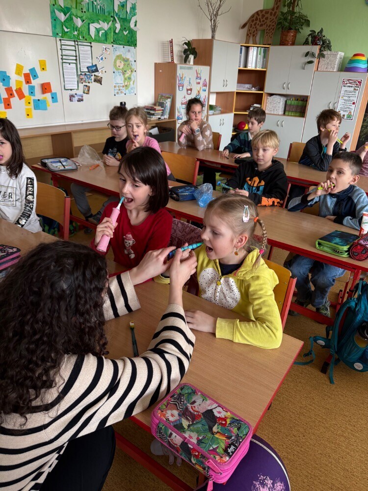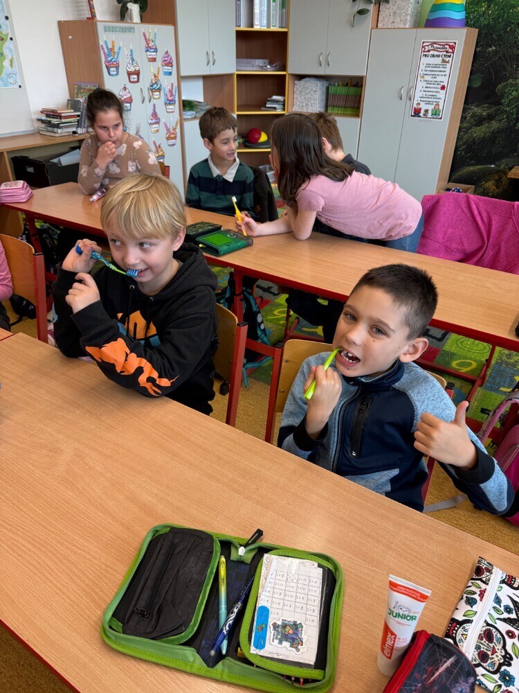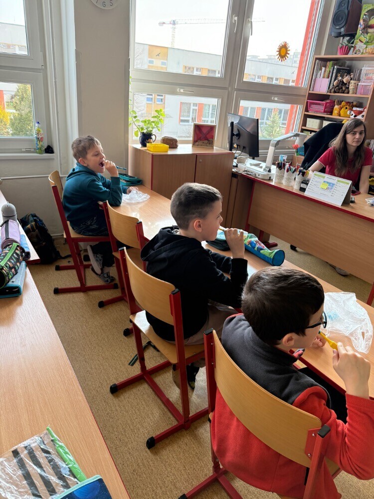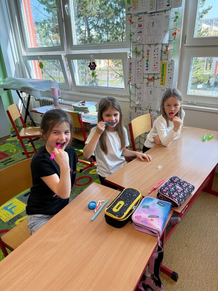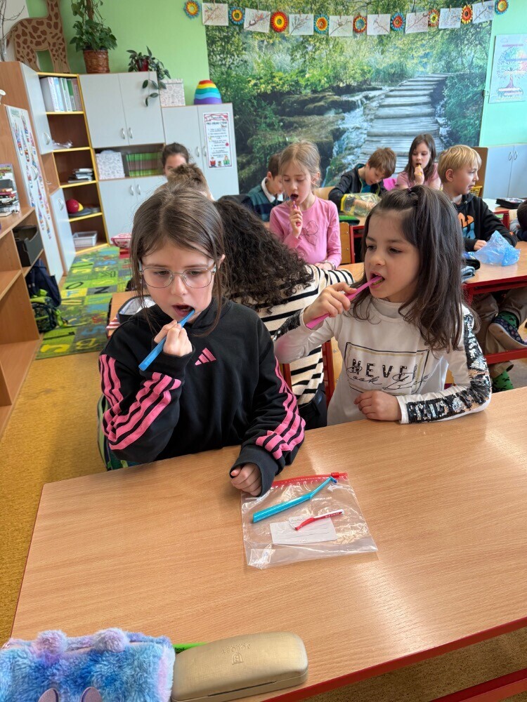 Ve středu nás navštívily studentky zubního lékařství, které si pro nás připravily zajímavou hodinu o péči o zuby. Společně jsme si povídali o tom, jak si zuby správně čistit a jaké pomůcky při tom používat.